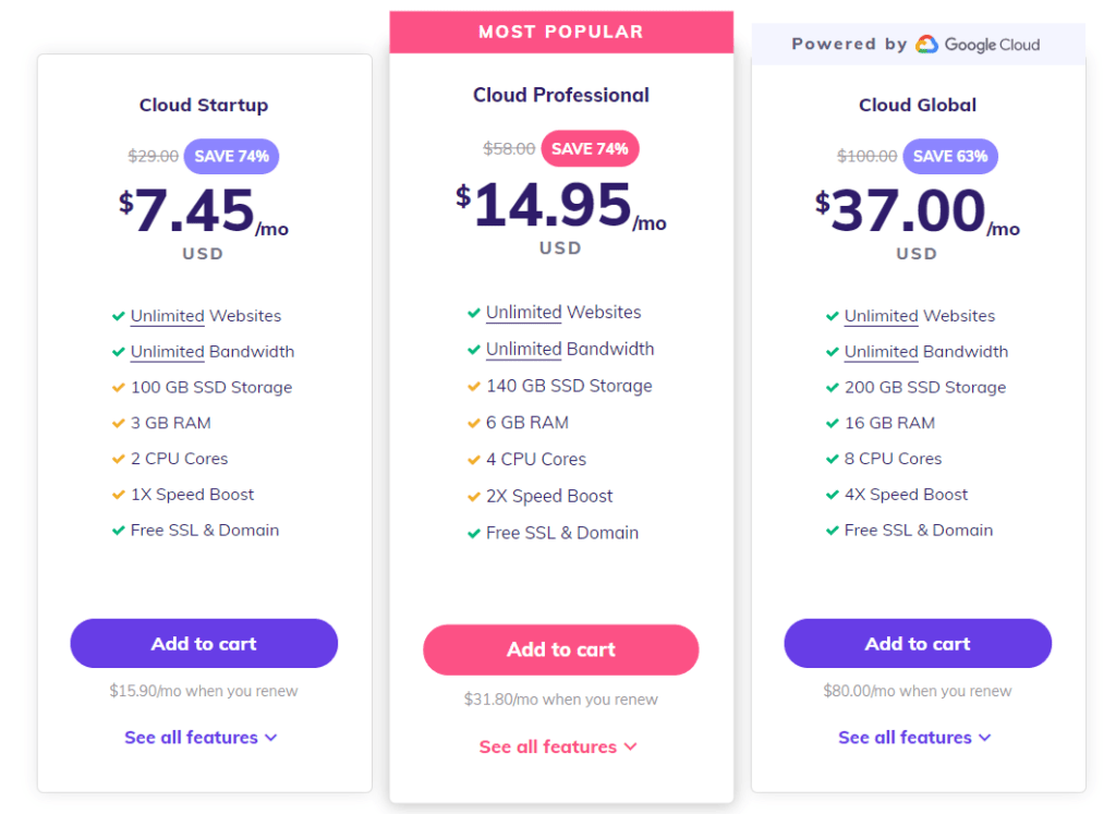Currently, they have 3 Cloud hosting plans: Startup, Professional, and Enterprise